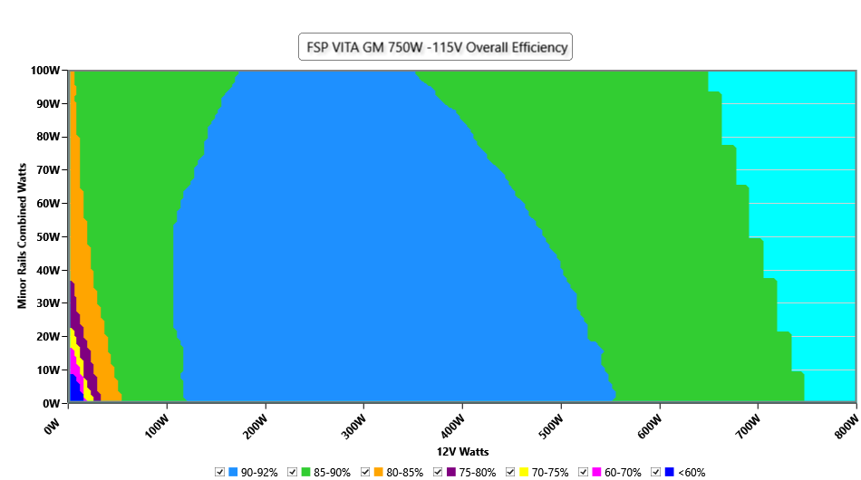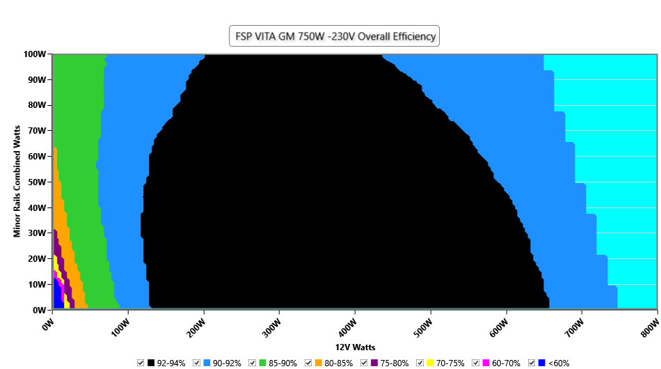 This graph depicts the PSU`s efficiency throughout its entire operational range. For the generation of the efficiency and noise graphs we set our loaders to auto mode through our custom-made software before trying thousands of possible load combinations