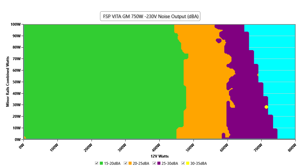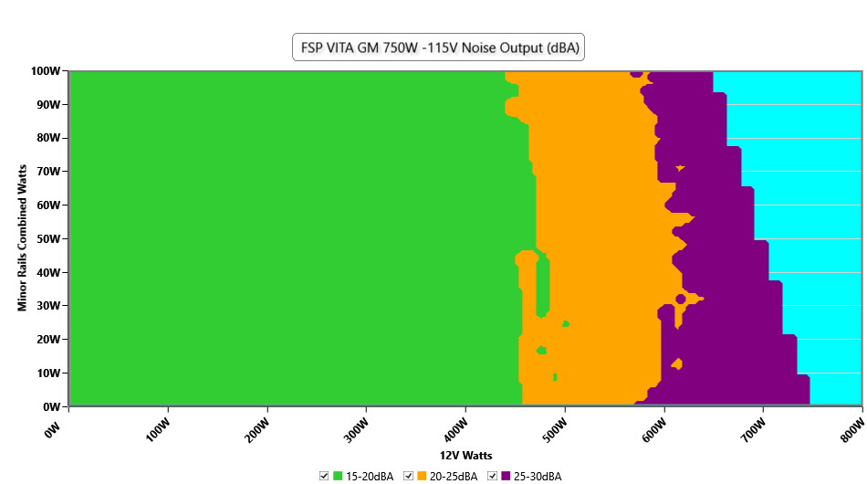 The PSU`s noise in its entire operational range and under 30-32 °C ambient is depicted in this graph. The X axis represents the load on the +12V rail(s) while the Y axis is the load on the minor rails