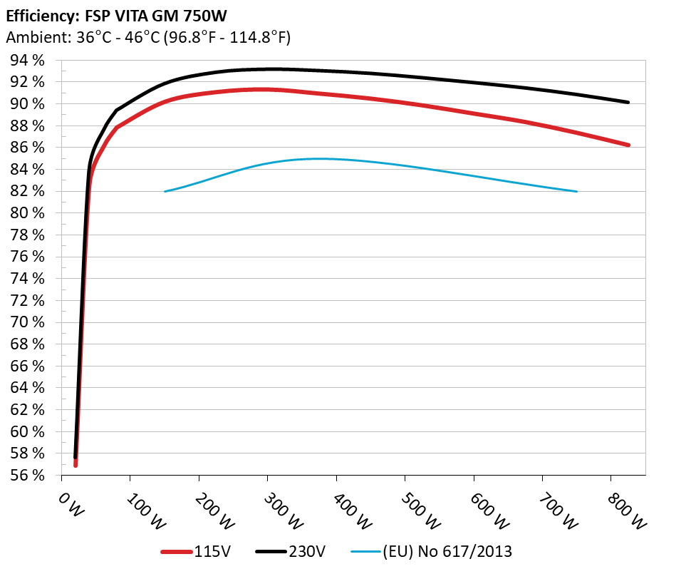 The PSU`s efficiency under high ambient temperatures with 115V and 230V input. For this graph the results of the 10-110% load regulation table are used