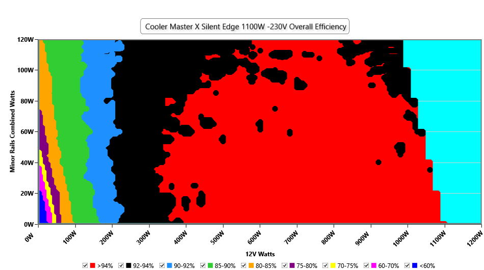This graph depicts the PSU`s efficiency throughout its entire operational range. For the generation of the efficiency and noise graphs we set our loaders to auto mode through our custom-made software before trying thousands of possible load combinations