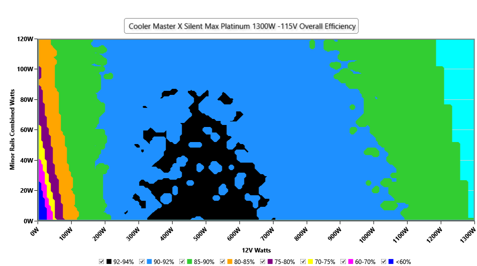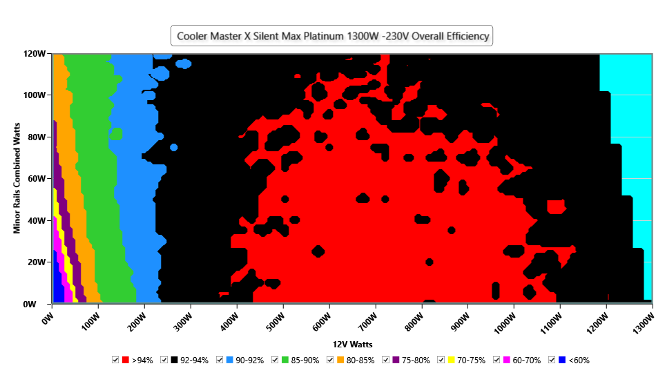 This graph depicts the PSU`s efficiency throughout its entire operational range. For the generation of the efficiency and noise graphs we set our loaders to auto mode through our custom-made software before trying thousands of possible load combinations