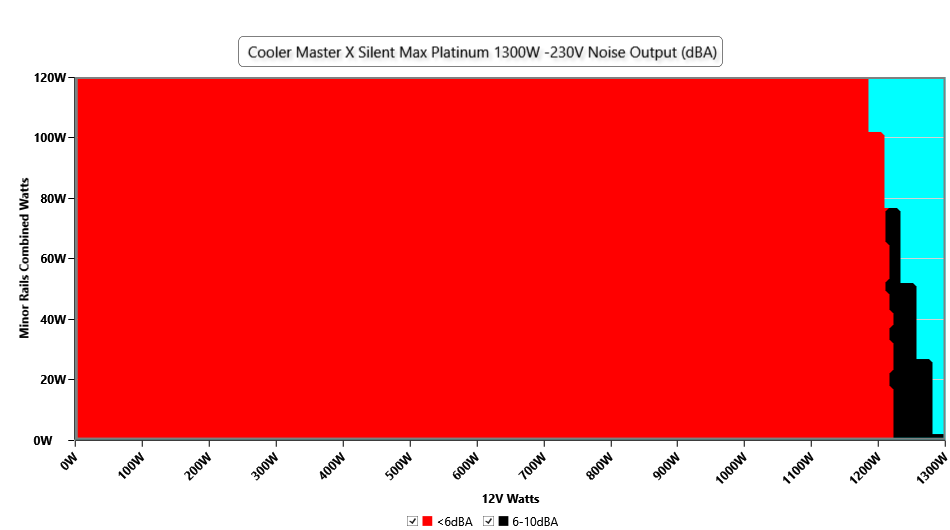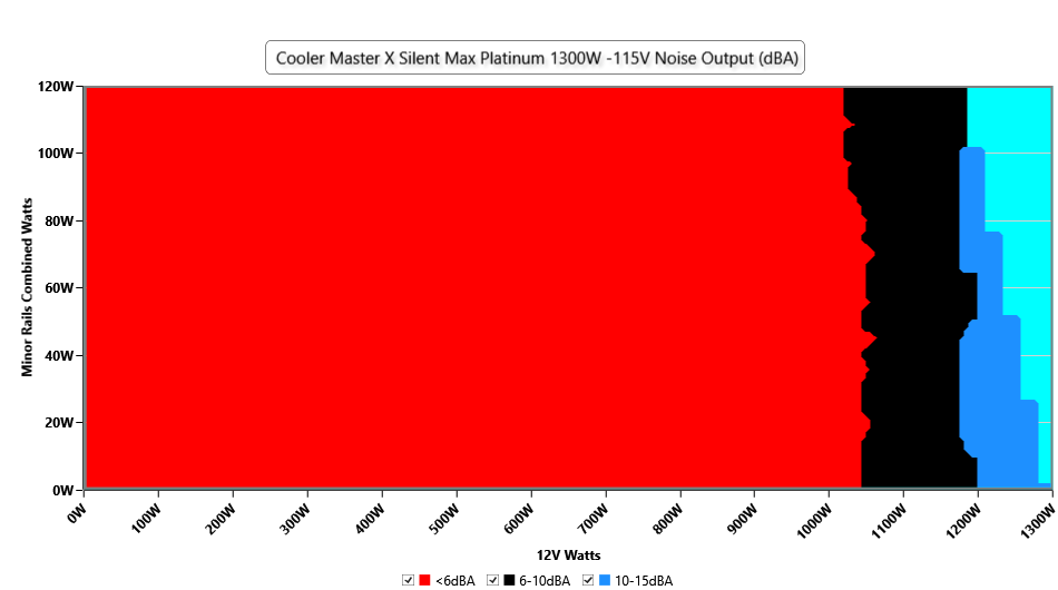 The PSU`s noise in its entire operational range and under 30-32 °C ambient is depicted in this graph. The X axis represents the load on the +12V rail(s) while the Y axis is the load on the minor rails