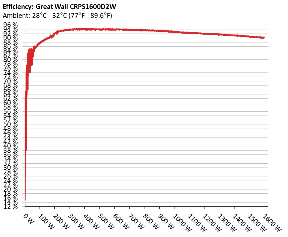 This graph depicts the PSU`s efficiency throughout its entire operational range. For the generation of the efficiency and noise graphs we set our loaders to auto mode through our custom-made software before trying thousands of possible load combinations