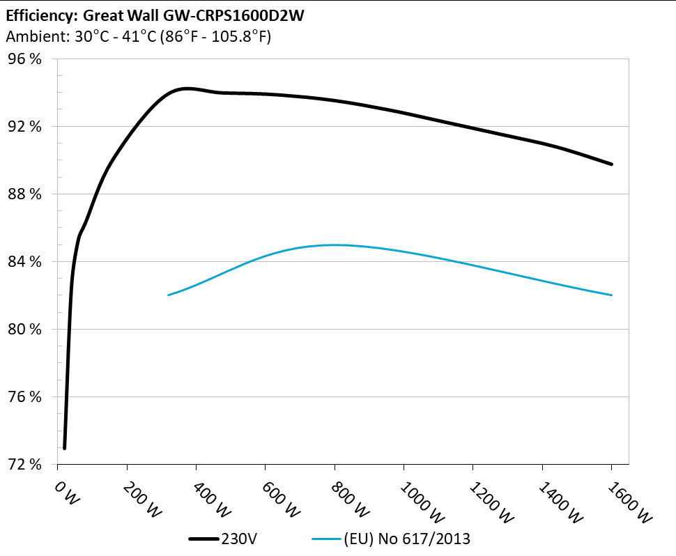 The PSU`s efficiency under high ambient temperatures with 230V input. For this graph, the results of the 10-100% load regulation table are used