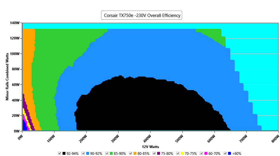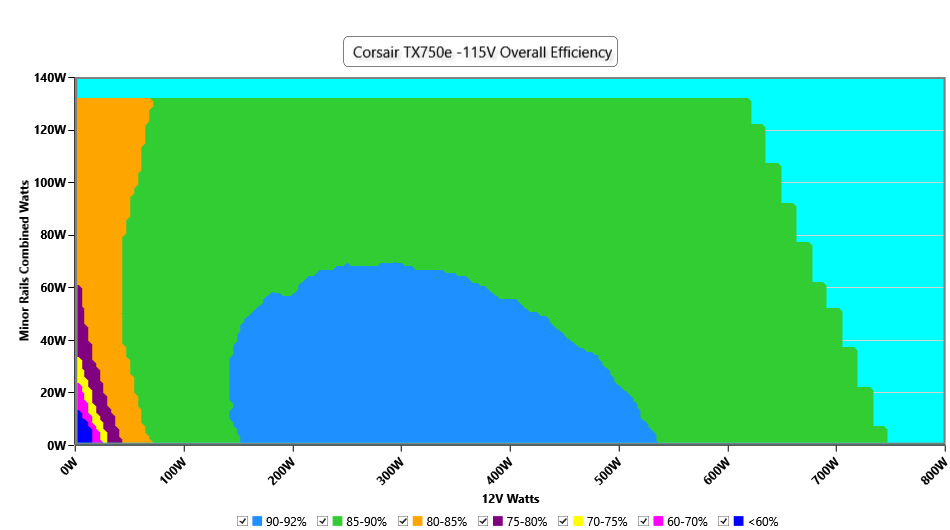 This graph depicts the PSU`s efficiency throughout its entire operational range. For the generation of the efficiency and noise graphs we set our loaders to auto mode through our custom-made software before trying thousands of possible load combinations