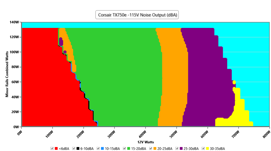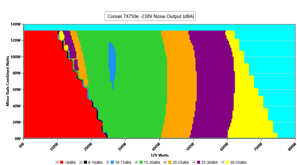 The PSU`s noise in its entire operational range and under 30-32 °C ambient is depicted in this graph. The X axis represents the load on the +12V rail(s) while the Y axis is the load on the minor rails
