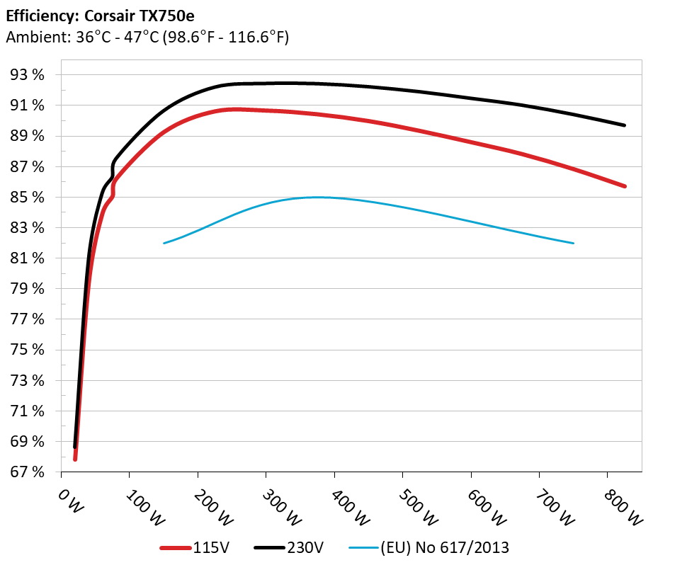 The PSU`s efficiency under high ambient temperatures with 115V and 230V input. For this graph the results of the 10-110% load regulation table are used
