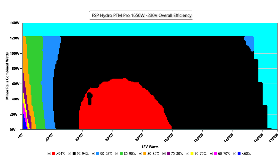 This graph depicts the PSU`s efficiency throughout its entire operational range. For the generation of the efficiency and noise graphs we set our loaders to auto mode through our custom-made software before trying thousands of possible load combinations
