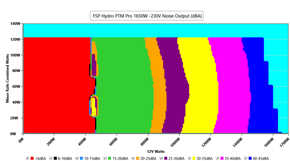 The PSU`s noise in its entire operational range and under 30-32 °C ambient is depicted in this graph. The X axis represents the load on the +12V rail(s) while the Y axis is the load on the minor rails