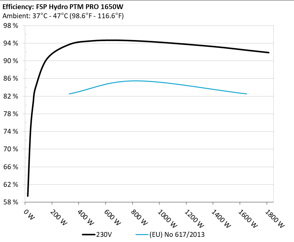 The PSU`s efficiency under high ambient temperatures with 115V and 230V input. For this graph the results of the 10-110% load regulation table are used