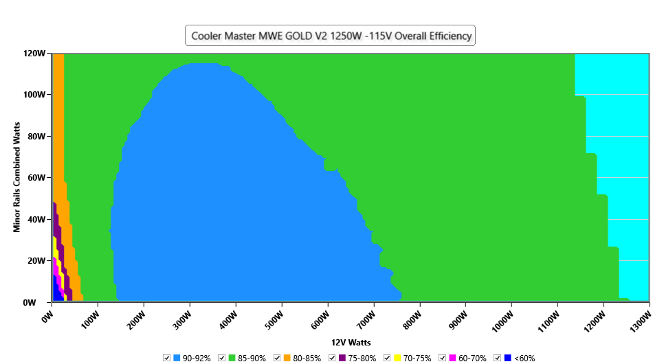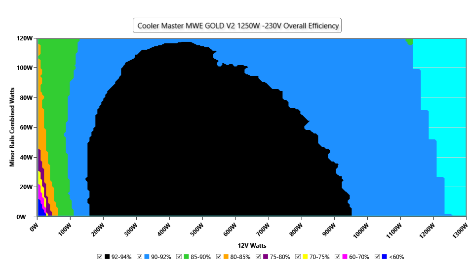 This graph depicts the PSU`s efficiency throughout its entire operational range. For the generation of the efficiency and noise graphs we set our loaders to auto mode through our custom-made software before trying thousands of possible load combinations