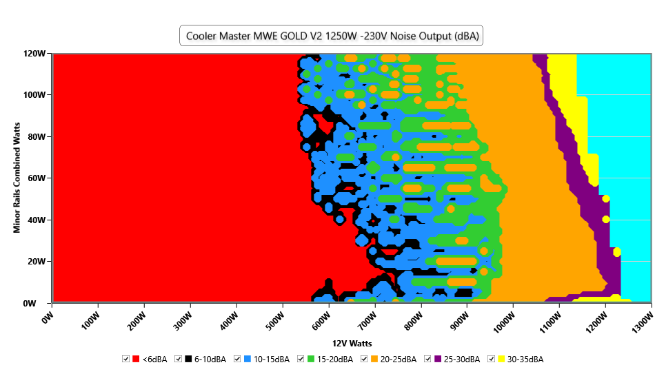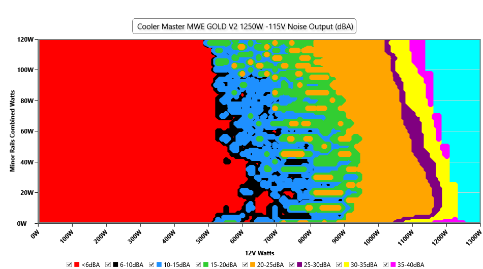 The PSU`s noise in its entire operational range and under 30-32 °C ambient is depicted in this graph. The X axis represents the load on the +12V rail(s) while the Y axis is the load on the minor rails