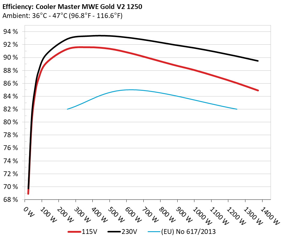 The PSU`s efficiency under high ambient temperatures with 115V and 230V input. For this graph the results of the 10-110% load regulation table are used