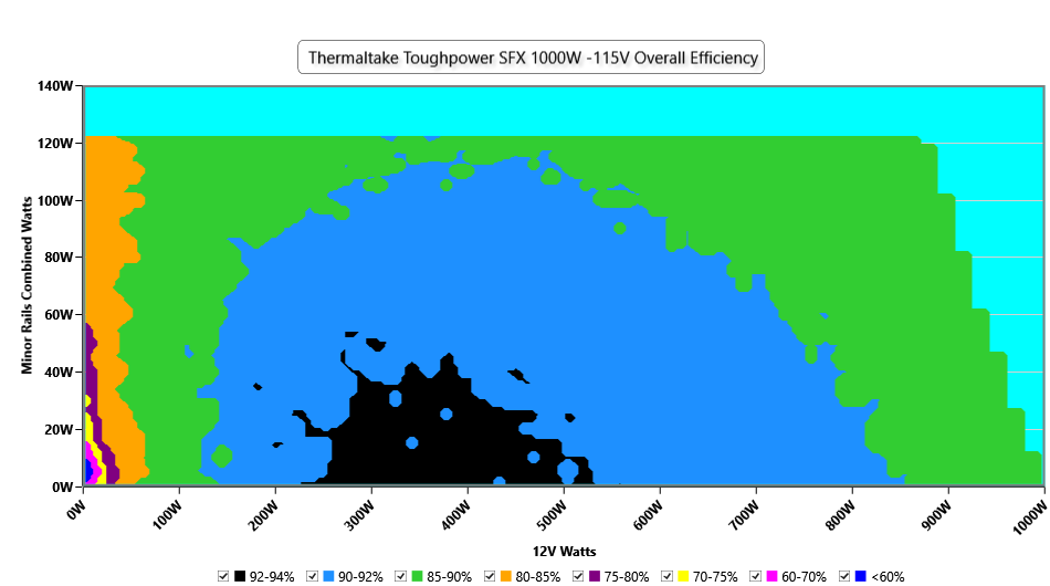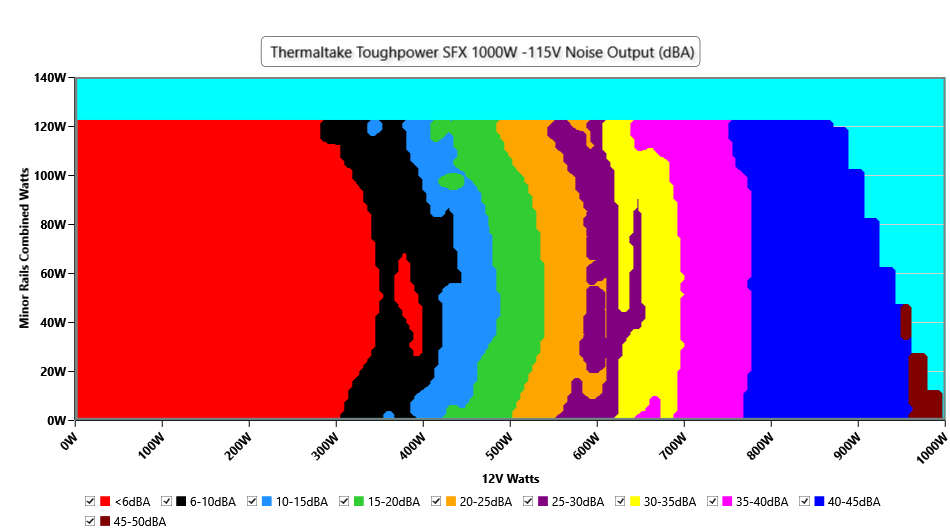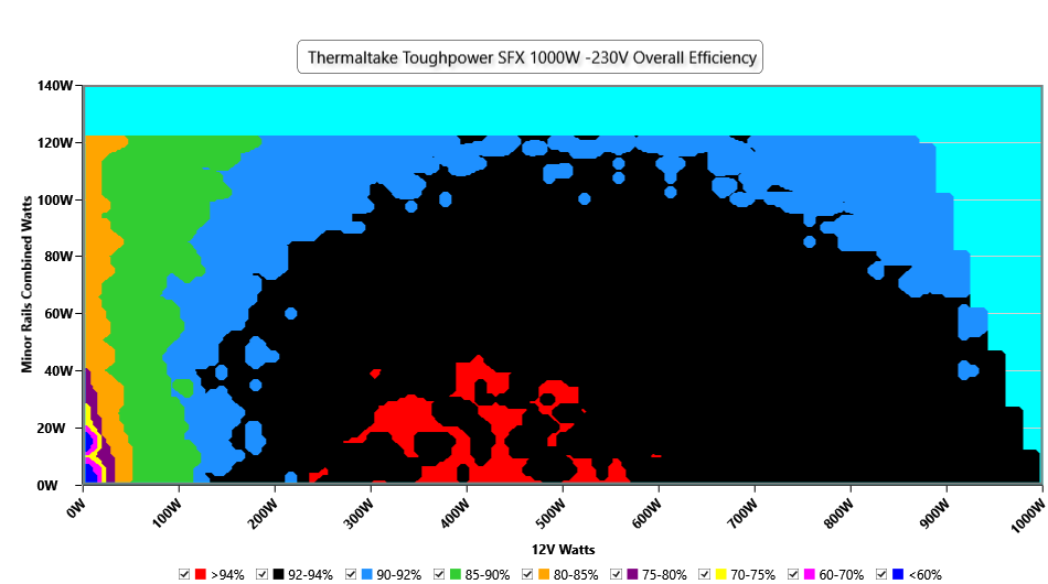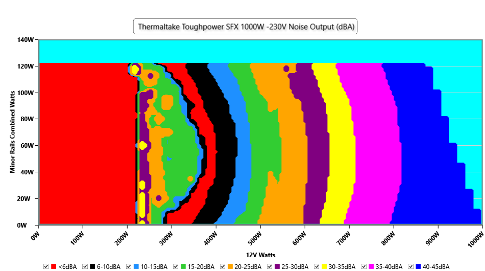 This graph depicts the PSU`s efficiency throughout its entire operational range. For the generation of the efficiency and noise graphs we set our loaders to auto mode through our custom-made software before trying thousands of possible load combinations