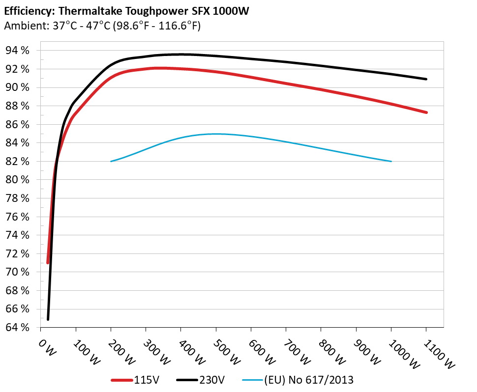 The PSU`s efficiency under high ambient temperatures with 115V and 230V input. For this graph the results of the 10-110% load regulation table are used