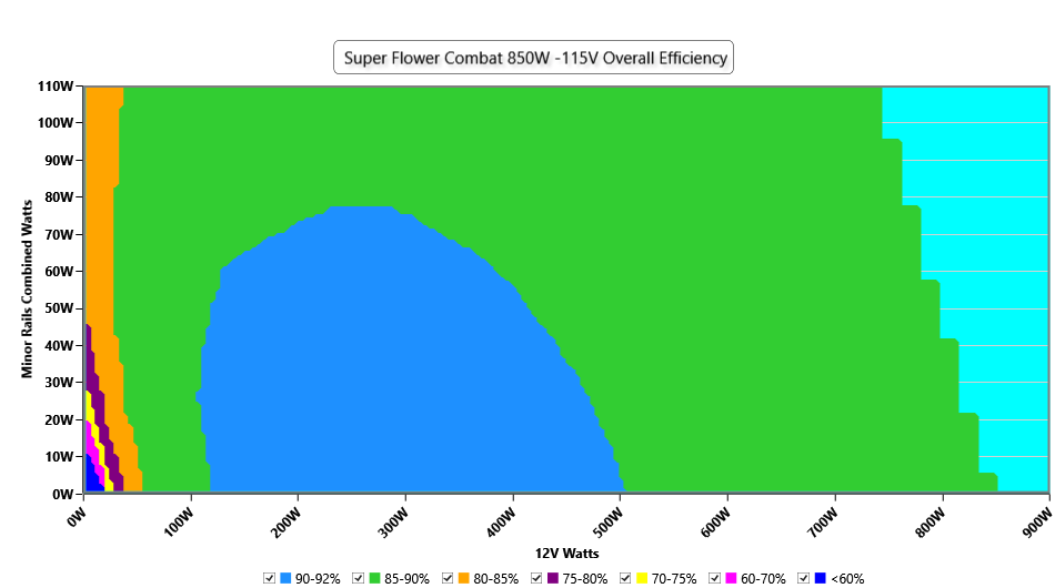 This graph depicts the PSU`s efficiency throughout its entire operational range. For the generation of the efficiency and noise graphs we set our loaders to auto mode through our custom-made software before trying thousands of possible load combinations