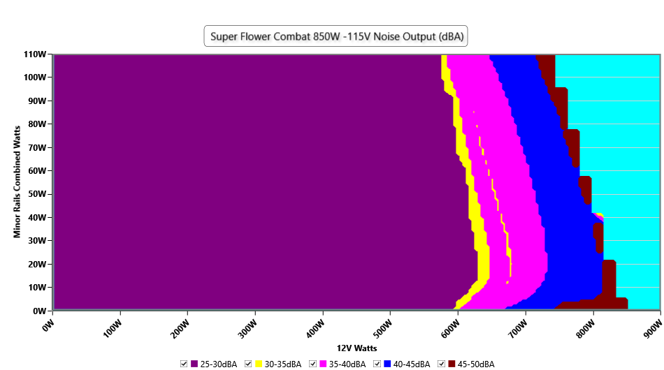 The PSU`s noise in its entire operational range and under 30-32 °C ambient is depicted in this graph. The X axis represents the load on the +12V rail(s) while the Y axis is the load on the minor rails