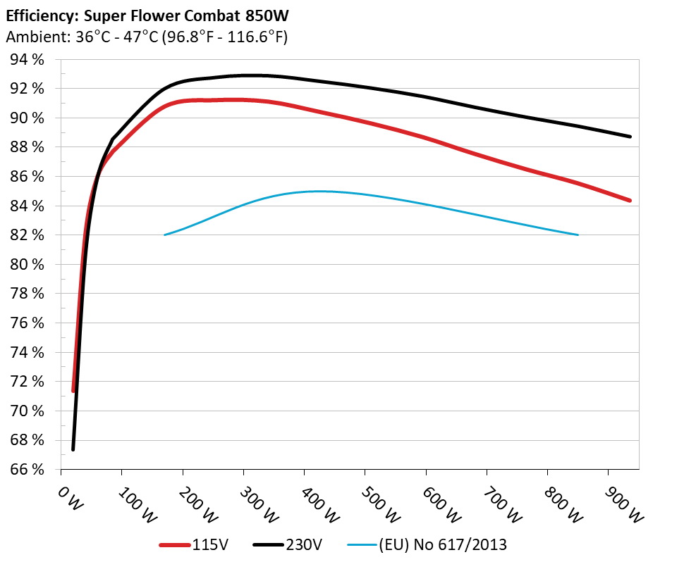 The PSU`s efficiency under high ambient temperatures with 115V and 230V input. For this graph the results of the 10-110% load regulation table are used