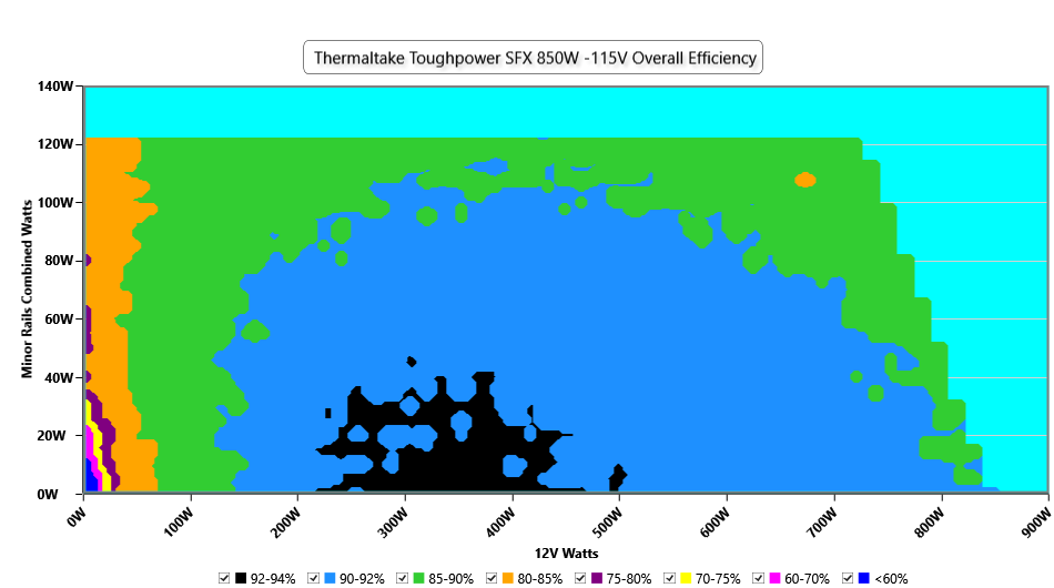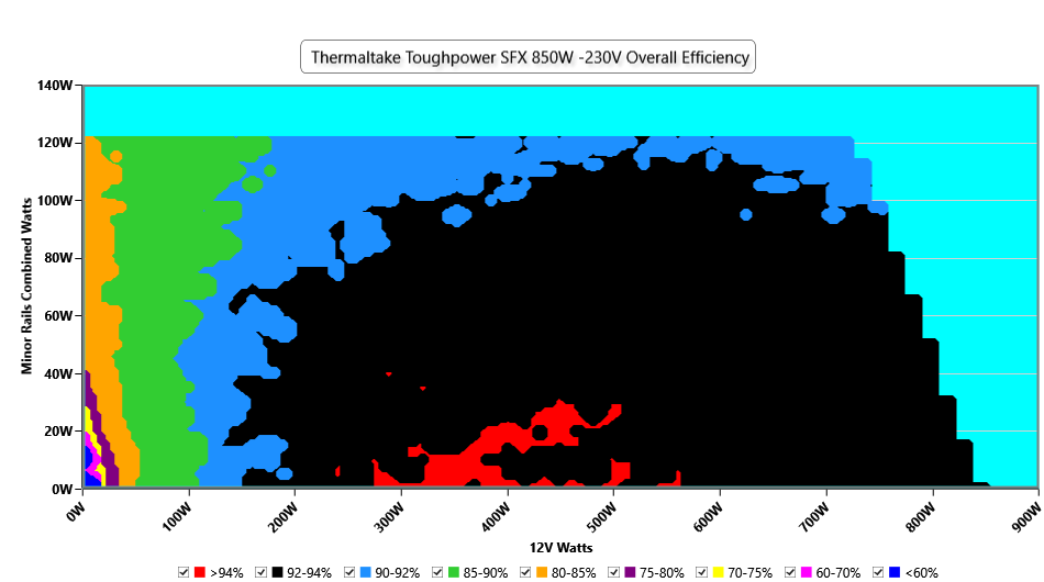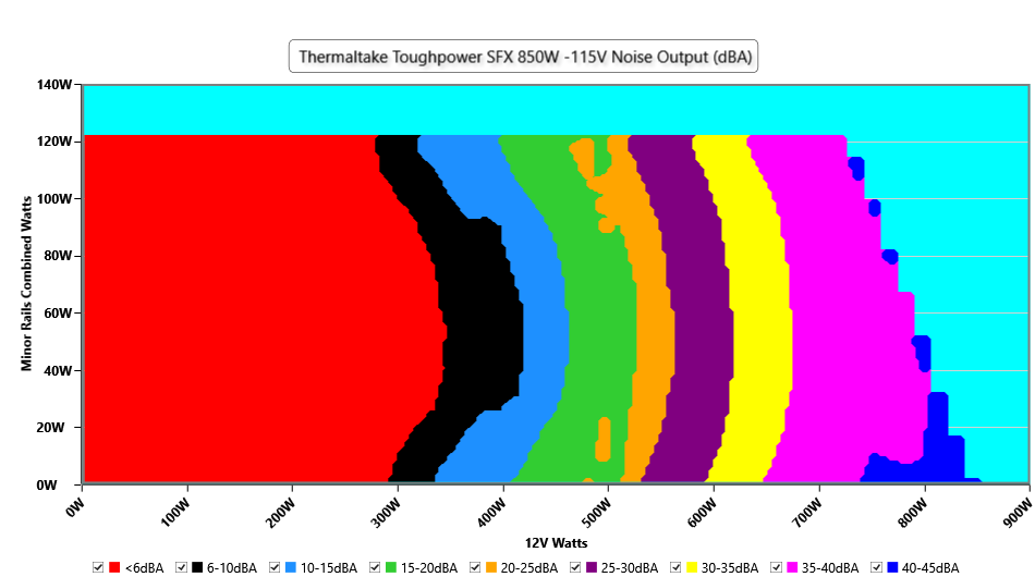 This graph depicts the PSU`s efficiency throughout its entire operational range. For the generation of the efficiency and noise graphs we set our loaders to auto mode through our custom-made software before trying thousands of possible load combinations
