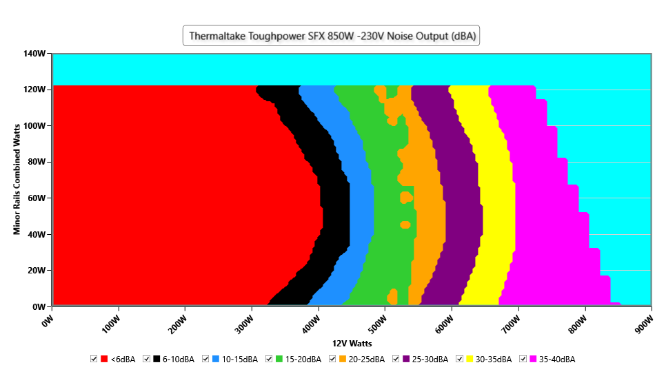 The PSU`s noise in its entire operational range and under 30-32 °C ambient is depicted in this graph. The X axis represents the load on the +12V rail(s) while the Y axis is the load on the minor rails