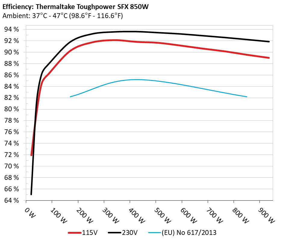 The PSU`s efficiency under high ambient temperatures with 115V and 230V input. For this graph the results of the 10-110% load regulation table are used