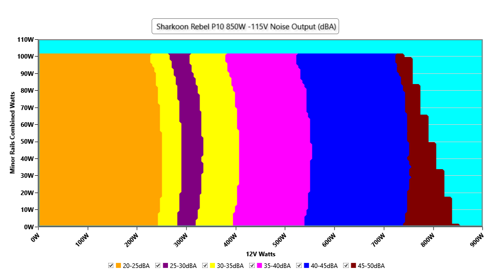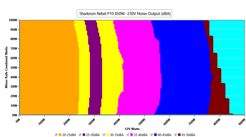 The PSU`s noise in its entire operational range and under 30-32 °C ambient is depicted in this graph. The X axis represents the load on the +12V rail(s) while the Y axis is the load on the minor rails