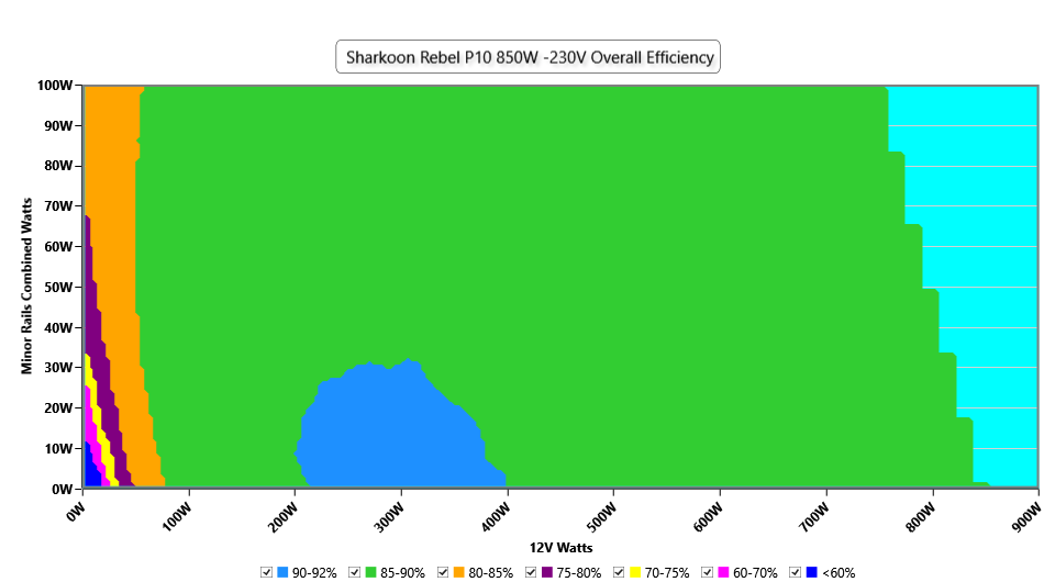 This graph depicts the PSU`s efficiency throughout its entire operational range. For the generation of the efficiency and noise graphs we set our loaders to auto mode through our custom-made software before trying thousands of possible load combinations