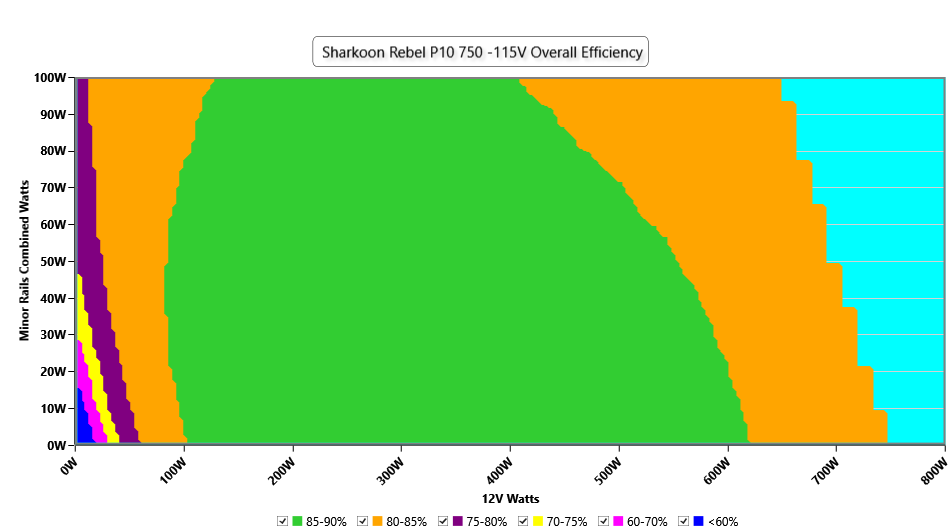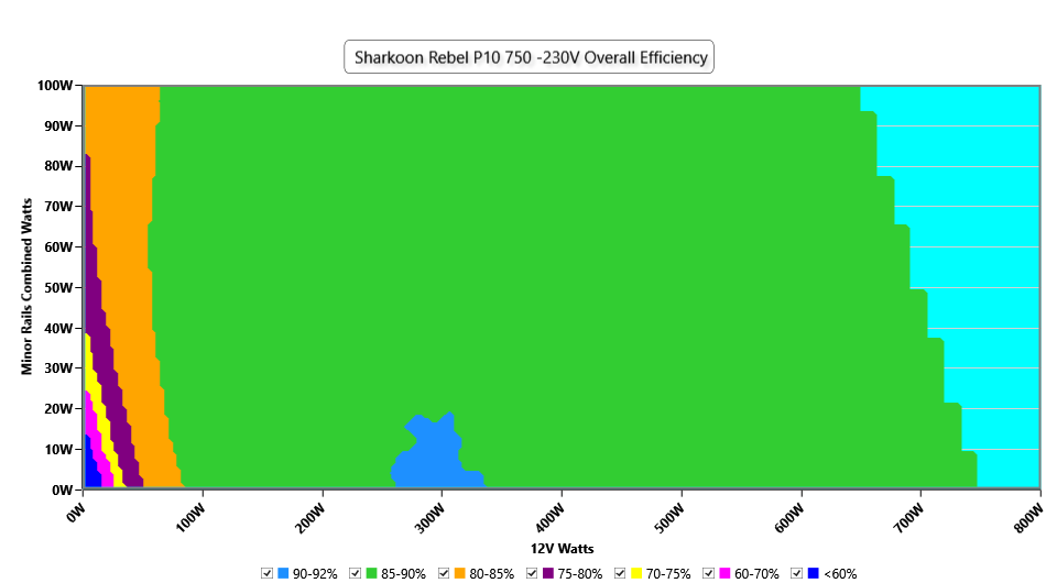 This graph depicts the PSU`s efficiency throughout its entire operational range. For the generation of the efficiency and noise graphs we set our loaders to auto mode through our custom-made software before trying thousands of possible load combinations