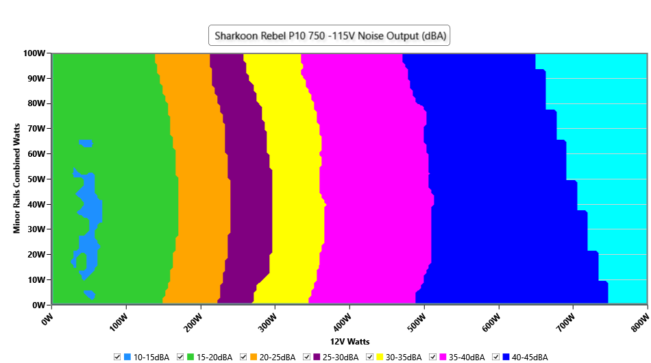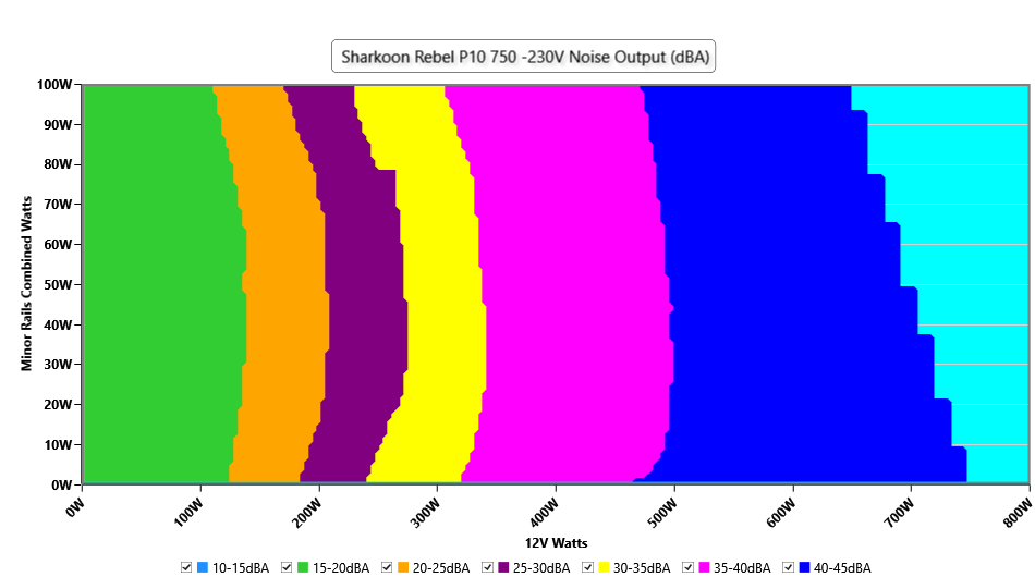 The PSU`s noise in its entire operational range and under 30-32 °C ambient is depicted in this graph. The X axis represents the load on the +12V rail(s) while the Y axis is the load on the minor rails