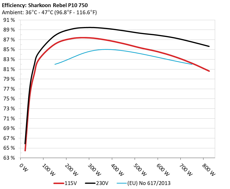 The PSU`s efficiency under high ambient temperatures with 115V and 230V input. For this graph the results of the 10-110% load regulation table are used