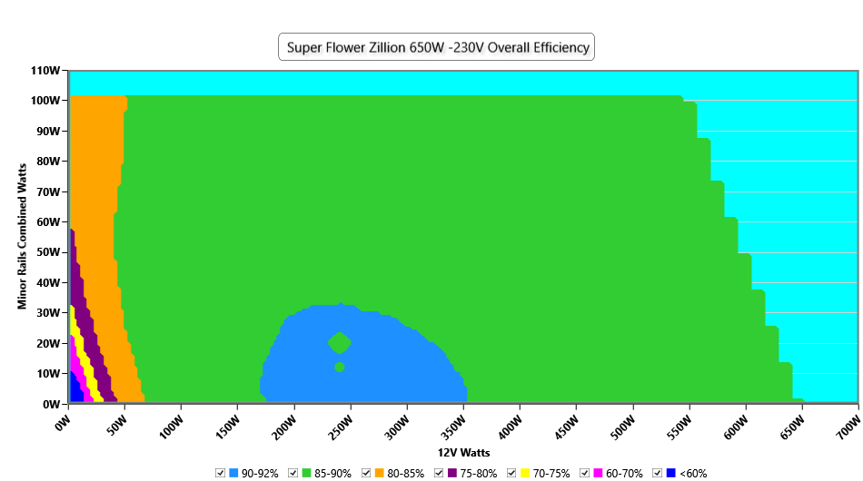 This graph depicts the PSU`s efficiency throughout its entire operational range. For the generation of the efficiency and noise graphs we set our loaders to auto mode through our custom-made software before trying thousands of possible load combinations