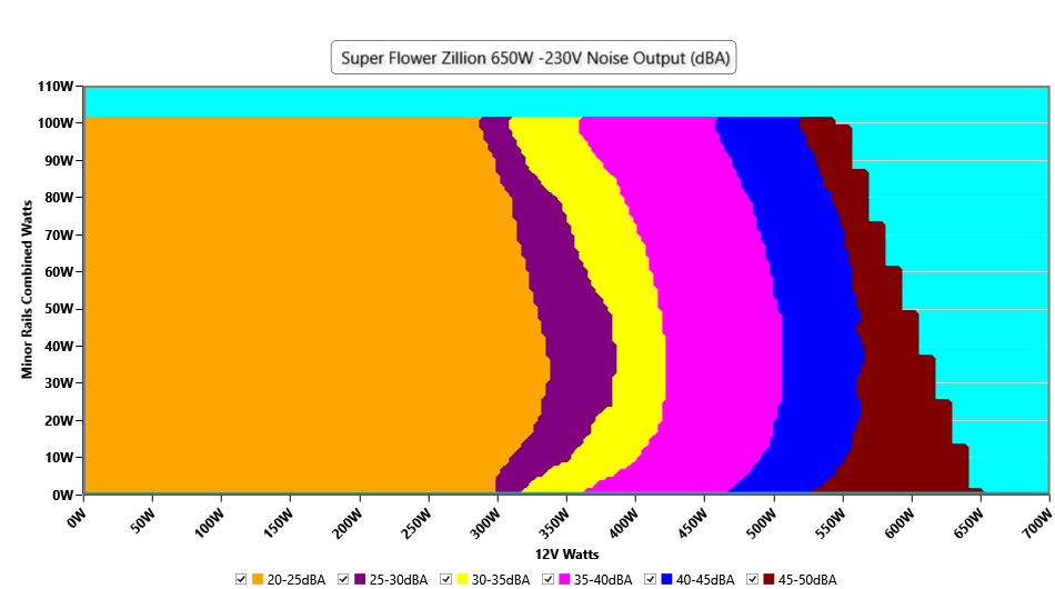 The PSU`s noise in its entire operational range and under 30-32 °C ambient is depicted in this graph. The X axis represents the load on the +12V rail(s) while the Y axis is the load on the minor rails