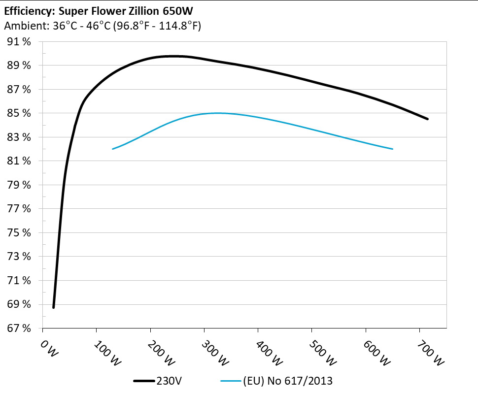 The PSU`s efficiency under high ambient temperatures with 115V and 230V input. For this graph the results of the 10-110% load regulation table are used