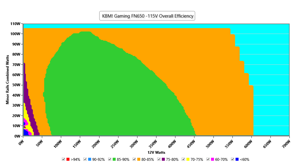 This graph depicts the PSU`s efficiency throughout its entire operational range. For the generation of the efficiency and noise graphs we set our loaders to auto mode through our custom-made software before trying thousands of possible load combinations