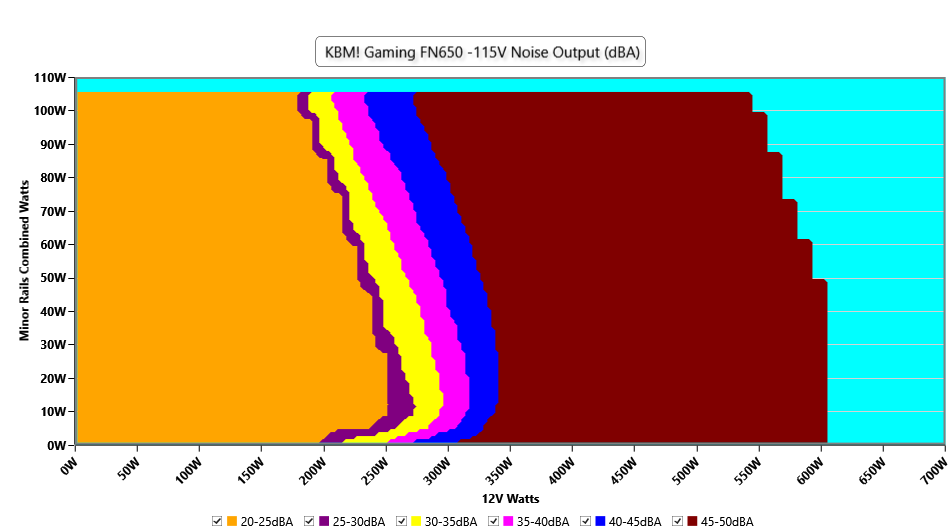 The PSU`s noise in its entire operational range and under 30-32 °C ambient is depicted in this graph. The X axis represents the load on the +12V rail(s) while the Y axis is the load on the minor rails