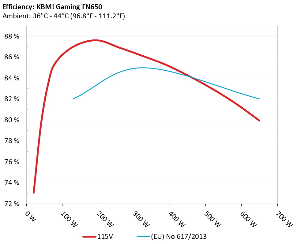 The PSU`s efficiency under high ambient temperatures with 115V and 230V input. For this graph the results of the 10-110% load regulation table are used