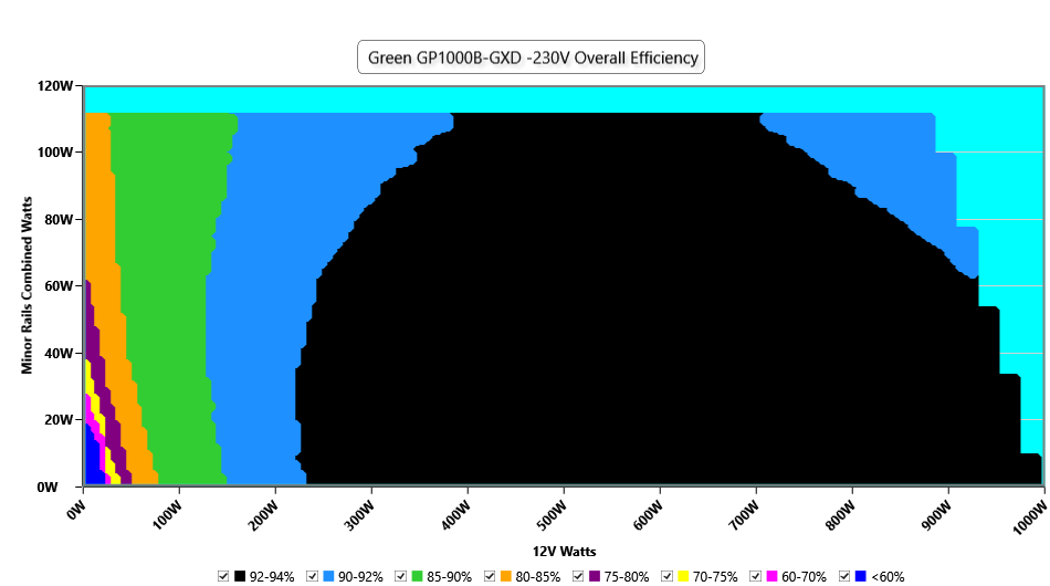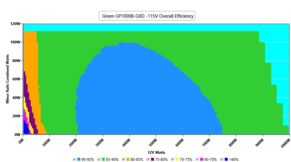 This graph depicts the PSU`s efficiency throughout its entire operational range. For the generation of the efficiency and noise graphs we set our loaders to auto mode through our custom-made software before trying thousands of possible load combinations