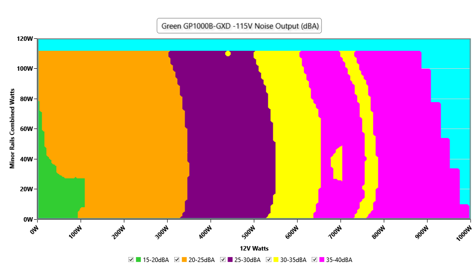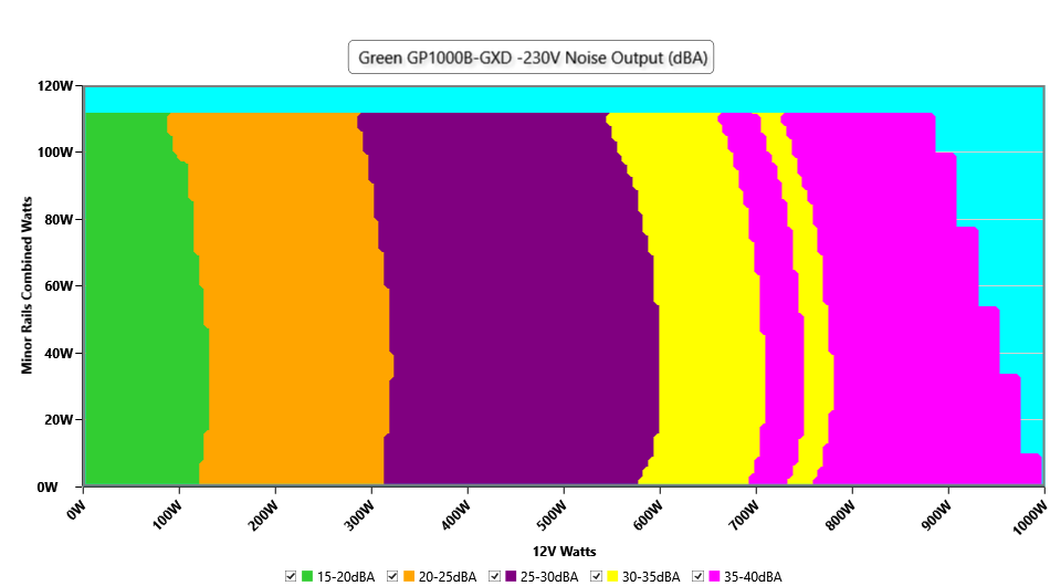 The PSU`s noise in its entire operational range and under 30-32 °C ambient is depicted in this graph. The X axis represents the load on the +12V rail(s) while the Y axis is the load on the minor rails