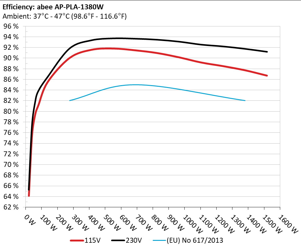 The PSU`s efficiency under high ambient temperatures with 115V and 230V input. For this graph the results of the 10-110% load regulation table are used