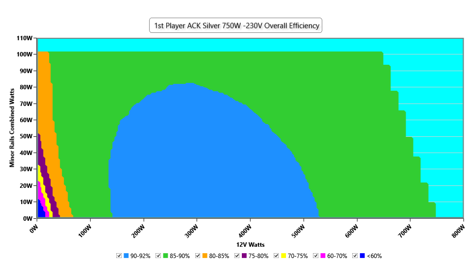 This graph depicts the PSU`s efficiency throughout its entire operational range. For the generation of the efficiency and noise graphs we set our loaders to auto mode through our custom-made software before trying thousands of possible load combinations