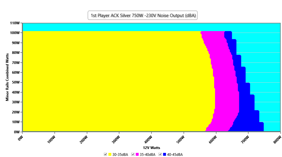 The PSU`s noise in its entire operational range and under 30-32 °C ambient is depicted in this graph. The X axis represents the load on the +12V rail(s) while the Y axis is the load on the minor rails