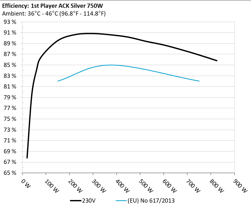 The PSU`s efficiency under high ambient temperatures with 115V and 230V input. For this graph the results of the 10-110% load regulation table are used