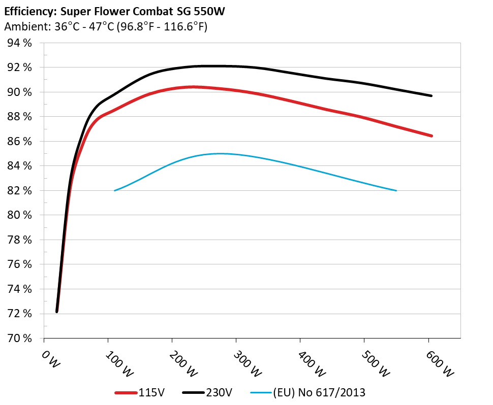 The PSU`s efficiency under high ambient temperatures with 115V and 230V input. For this graph the results of the 10-110% load regulation table are used