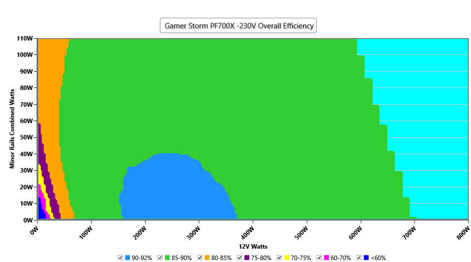 This graph depicts the PSU`s efficiency throughout its entire operational range. For the generation of the efficiency and noise graphs we set our loaders to auto mode through our custom-made software before trying thousands of possible load combinations