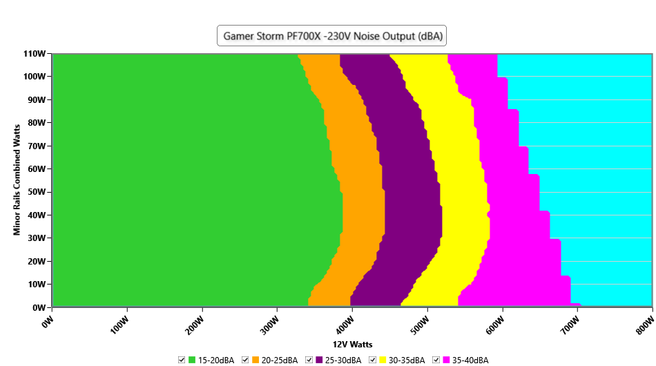 The PSU`s noise in its entire operational range and under 30-32 °C ambient is depicted in this graph. The X axis represents the load on the +12V rail(s) while the Y axis is the load on the minor rails