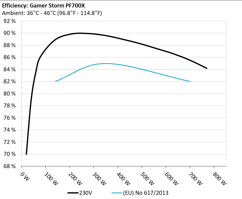 The PSU`s efficiency under high ambient temperatures with 115V and 230V input. For this graph the results of the 10-110% load regulation table are used