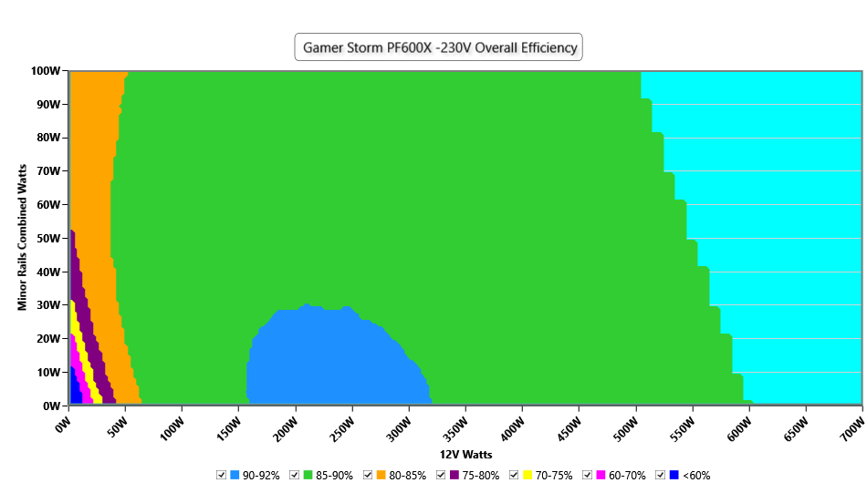 This graph depicts the PSU`s efficiency throughout its entire operational range. For the generation of the efficiency and noise graphs we set our loaders to auto mode through our custom-made software before trying thousands of possible load combinations