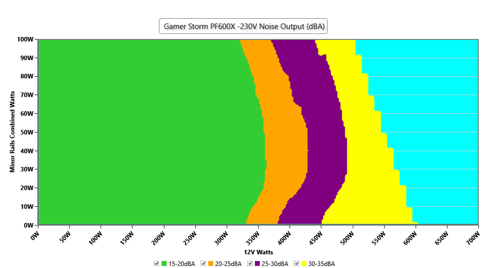 The PSU`s noise in its entire operational range and under 30-32 °C ambient is depicted in this graph. The X axis represents the load on the +12V rail(s) while the Y axis is the load on the minor rails