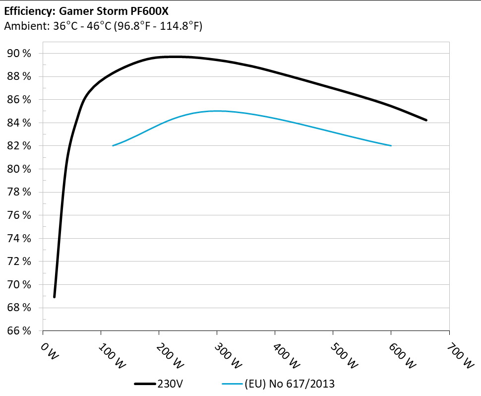 The PSU`s efficiency under high ambient temperatures with 115V and 230V input. For this graph the results of the 10-110% load regulation table are used