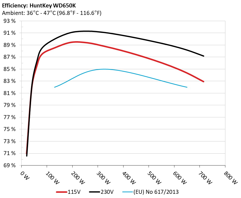 The PSU`s efficiency under high ambient temperatures with 115V and 230V input. For this graph the results of the 10-110% load regulation table are used